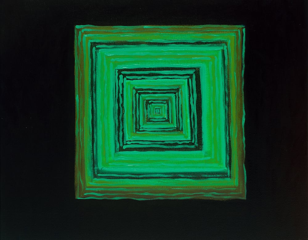 This image is part of a series of paintings that envision events in psychic space (emotional/psychological/spiritual occurrences) as features in an abstract physical landscape.